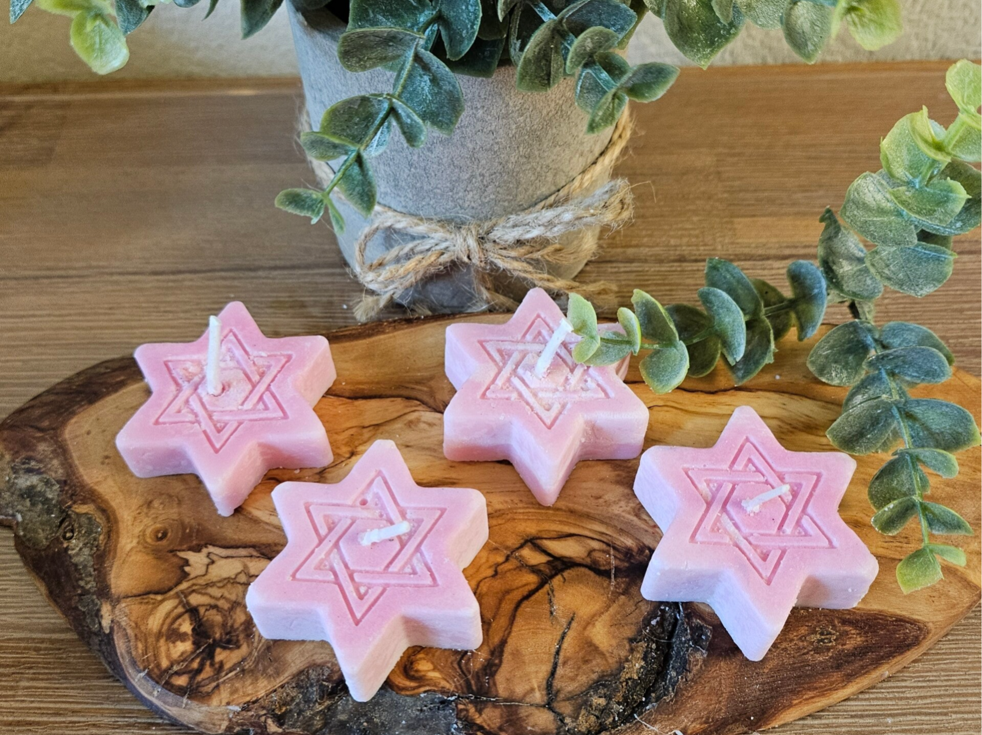 Strawberries & Peaches Scents. It contains 4 mini David's stars. It comes in different color combination pink, purple & green. Each weights 1oz.