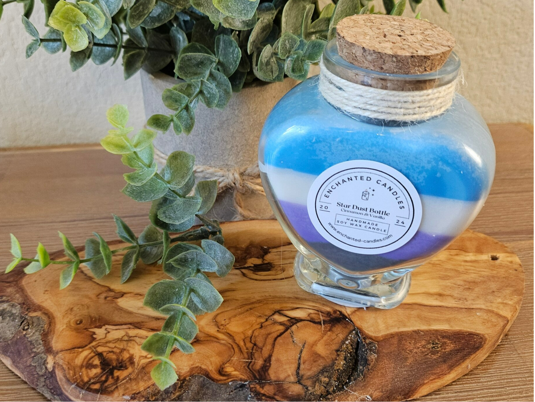 - The Star Dust Bottle (5oz): A stunning rainbow-colored glass heart container filled with a magical cinnamon and vanilla scent.