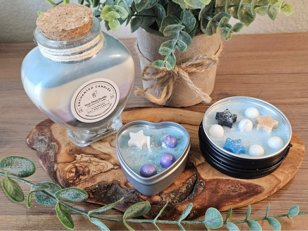 - Star Dust Bottle (5oz): A captivating rainbow-colored glass heart container filled with the enchanting blend of cinnamon and vanilla.