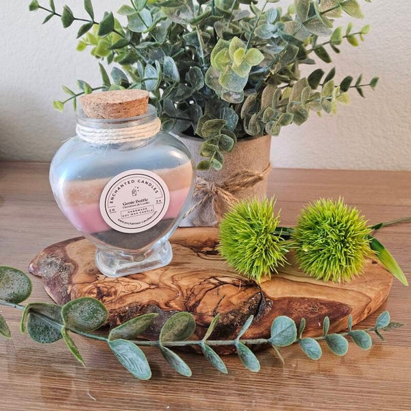 - The Genie Bottle (5oz): A mesmerizing rainbow-colored glass heart container filled with the captivating blend of cinnamon and vanilla.