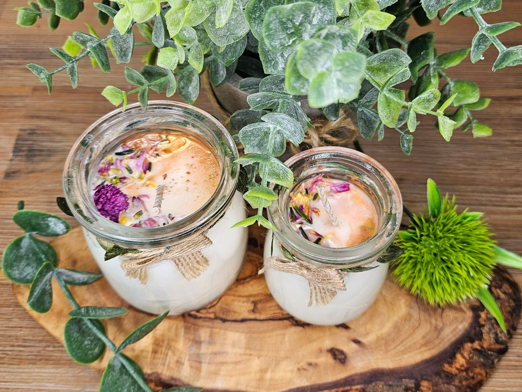 This thoughtfully crafted set combines the soothing scents of freesia, peony and vanilla, each adorned with natural dried gomphrena, chrysanthemum, lotus seeds and a touch of shimmering mica powder.